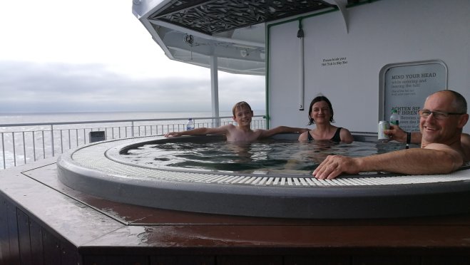 Gestern haben wir für 10 Uhr einen Hot Tub, also einen der drei heißen Außen-Pools, für eine Stunde gebucht. Hier entspannen wir jetzt mit Meerblick und tatsächlich kommt die Sonne ein klein wenig hervor. Da der Pool mit heißem Salzwasser gefüllt ist, duschen wir anschließend in unserer Kabine und relaxen bei ZDF neo bzw. lesen ein wenig. Die See ist übrigens recht ruhig und das Schiff rollt nur wenig aber doch spürbar.